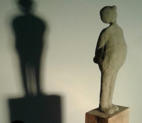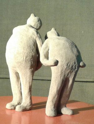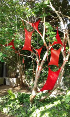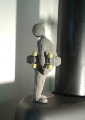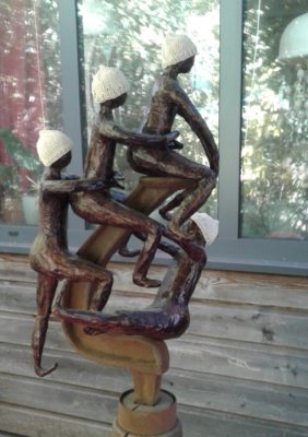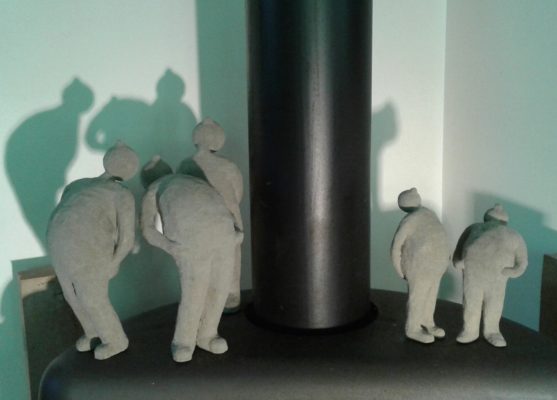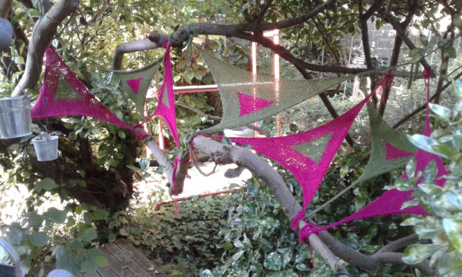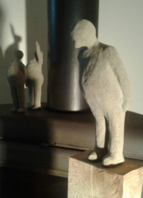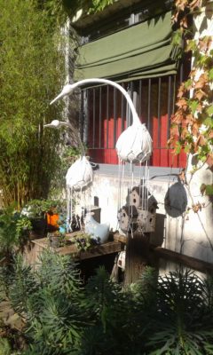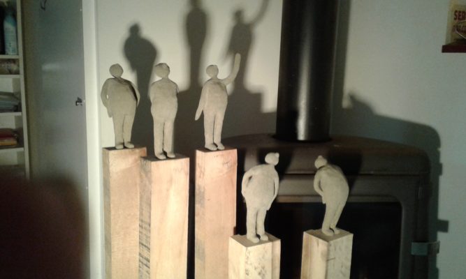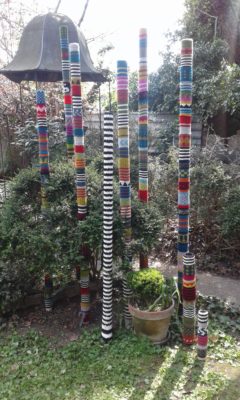 Pendant le confinement, travaux d’aiguilles au jardin. Et puis, le deconfinement, et la série des petits hommes en sable de Morgat.